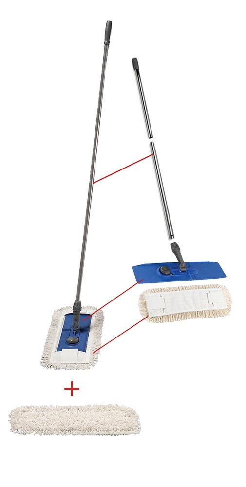 2-teiliger Chromstiel, Klapphalter für Moppbezüge mit Taschen in einer Breite von 400 mm, dazu 5 Baumwoll-Moppbezüge