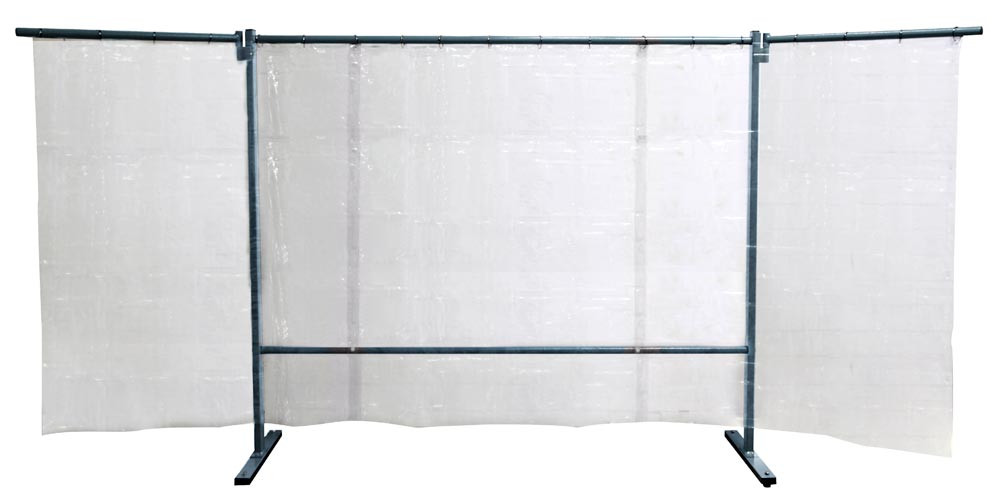 3-teilige Schutzwand mit Folienvorhang zum Schutz vor Strahlung, Schweißlichtbögen und Spritzern ∙ Grundgestell mit 2 ausklappbaren Schwenkarmen ∙ Farbe S7 (grün), S9 (dunkelgrün) und rot sind DIN EN ISO 25980 geprüft ∙ Farbe S0 glasklar ist selbstverlöschend, Klasse K 1, gemäß DIN 53 438, Teil 2 ∙ Bodenfreiheit 165 mm ∙ Radsatz als optionales Zubehör
