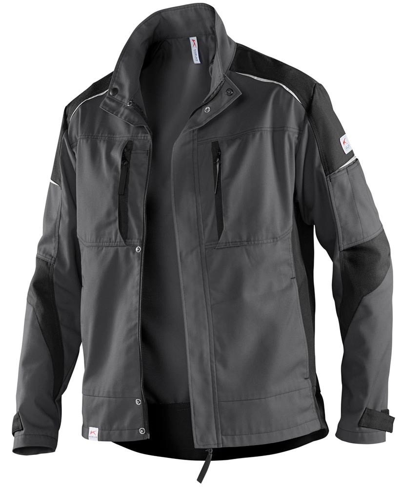 Zwei Seitentaschen mit Druckknopf ∙ Rechts: Stifttasche an Brusttasche ∙ Links: Armtasche mit integrierter Stifttasche ∙ Steh-/Umlegekragen ∙ Ärmelsaum mit Klette weitenregulierbar ∙ Belastungspunkte mit Riegeln gesichert