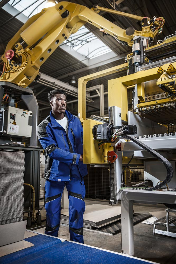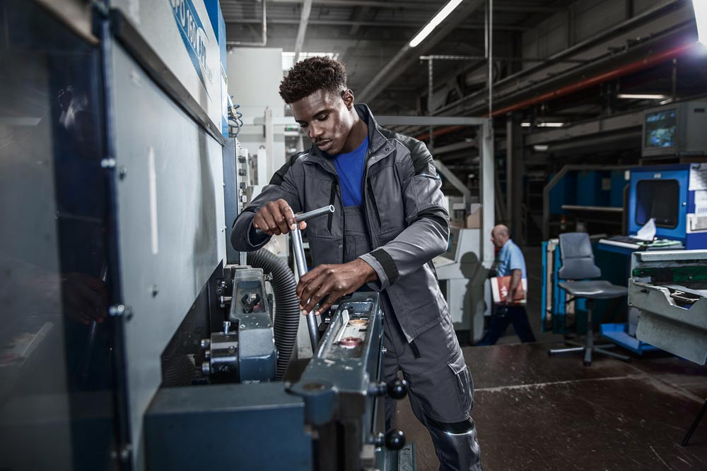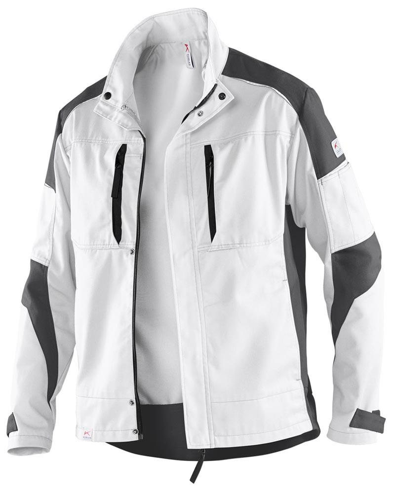 Zwei Seitentaschen mit Druckknopf ∙ Rechts: Stifttasche an Brusttasche ∙ Links: Armtasche mit integrierter Stifttasche ∙ Steh-/Umlegekragen ∙ Ärmelsaum mit Klette weitenregulierbar ∙ Belastungspunkte mit Riegeln gesichert