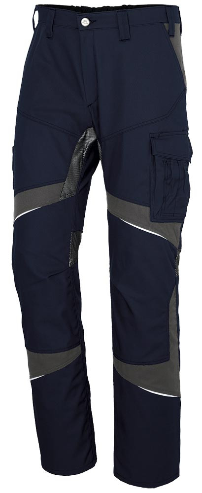 Material 65% Polyester, 35% Baumwolle, ca. 270g/m2 ∙ Ergonomische Linienführung für mehr Bewegungsfreiheit ∙ Zwei Seitentaschen ∙ Zwei Gesäßtaschen, rechts mit Patte und Druckknopf ∙ Rechts: ergonomisch positionierte Meterstabtasche auf Seitennaht ∙ Links: Schenkeltasche mit Patte und Druckknopf, aufgesetzte Stifttasche, integrierte Smartphonetasche ∙ Elastischer Bundeinsatz ∙ Schlitz mit Reißverschluss ∙ Vorgeformtes Knie mit Bewegungszone ∙ Belastungspunkte mit Riegeln gesichert ∙ Ventilationseinsatz in der Kniekehle und im Schritt für optimalen Temperaturausgleich
