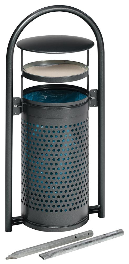 ∙ Mit Ascher ∙ Für 60/70 l Kunststoffsäcke ∙ Rohrbogen verzinkt ∙ Verriegelung des Korpus mit zwei Schlössern zum Schutz vor unbefugtem Öffnen ∙ Kopfteil dient gleichzeitig als Klemmvorrichtung für den Kunststoffsack ∙ Behältervolumen 65 l ∙ Zum Einbetonieren