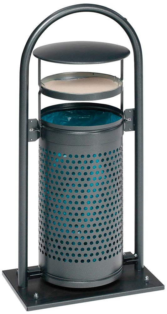 ∙ Für 60 bzw. 70 l Kunststoffsäcke ∙ Kopfteil und Korpus aus verzinktem Stahlblech pulverbeschichtet oder Stahlblech feuerverzinkt ∙ Rohrbogen und Grundplatte verzinkt ∙ Verriegelung des Korpus mit zwei Schlössern zum Schutz vor unbefugtem Öffnen ∙ Kopfteil dient gleichzeitig als Klemmvorrichtung für den Kunststoffsack ∙ Behältervolumen 65 l