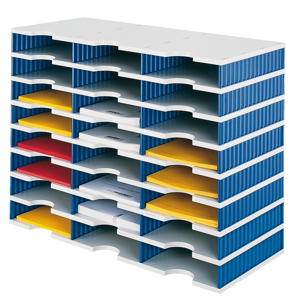 · Zur Verwahrung von Kopierpapier, Zeitschriften, etc. oder als Postsortieranlage · Durch Aufbaumodule jederzeit erweiter- und kombinierbar · Aus hochbelastbarem Polystyrol · Boden in grau, Seitenteile farblich abgesetzt · Inkl. Beschriftungsschilder · Anlieferung erfolgt zerlegt im handlichen Karton