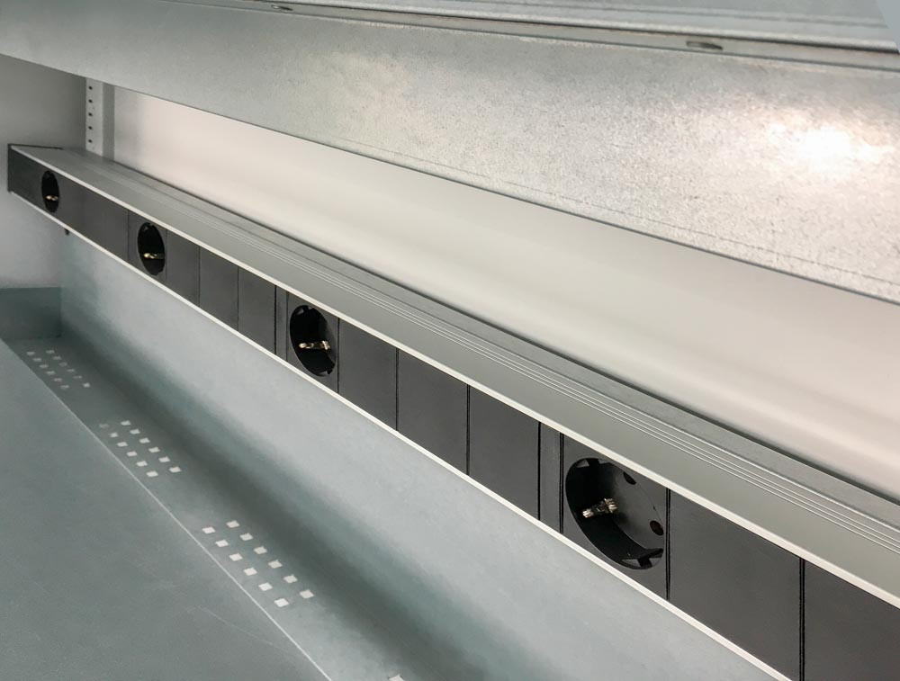 ∙ 1 verzinkter Einlegeboden unten ∙ 3 E-Böden, je Boden eine 5-fach Steckdosenleiste