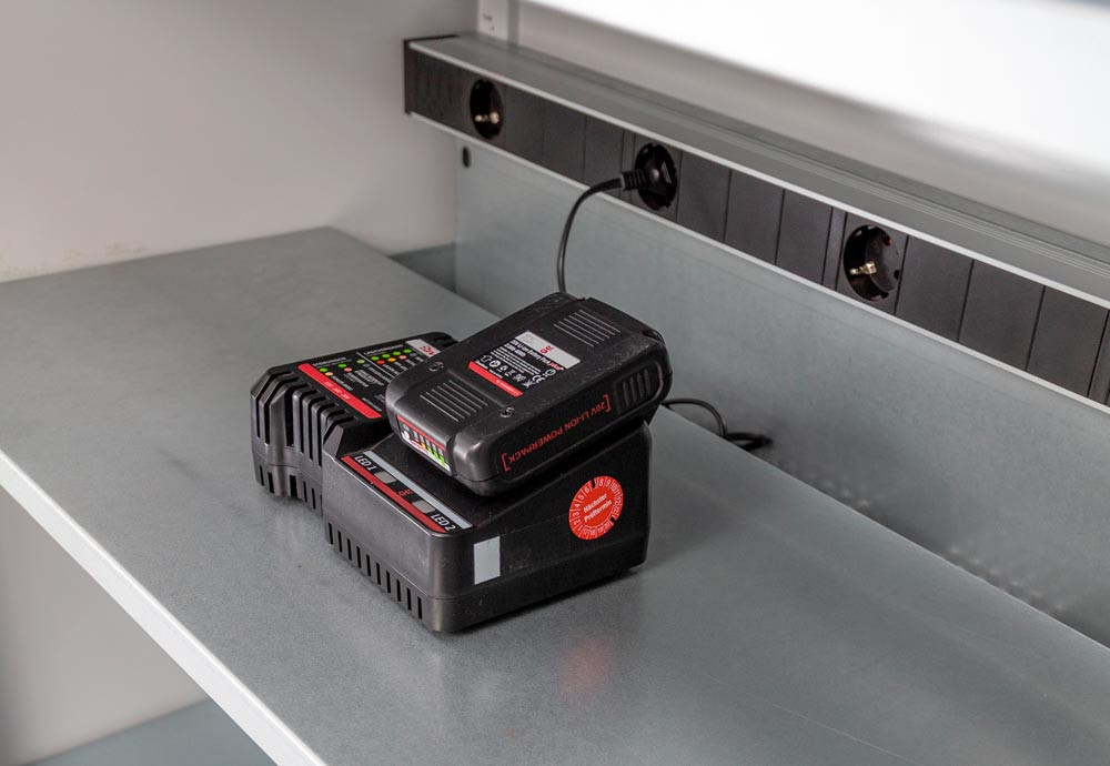 Akkulade-Schrank, Vollblechtüren, BxTxH 930x500x1950 mm, 3 Böden mit je 5-fach Steckdosenleiste,1 Einlegeboden, RAL 7035/5010 E6409429
