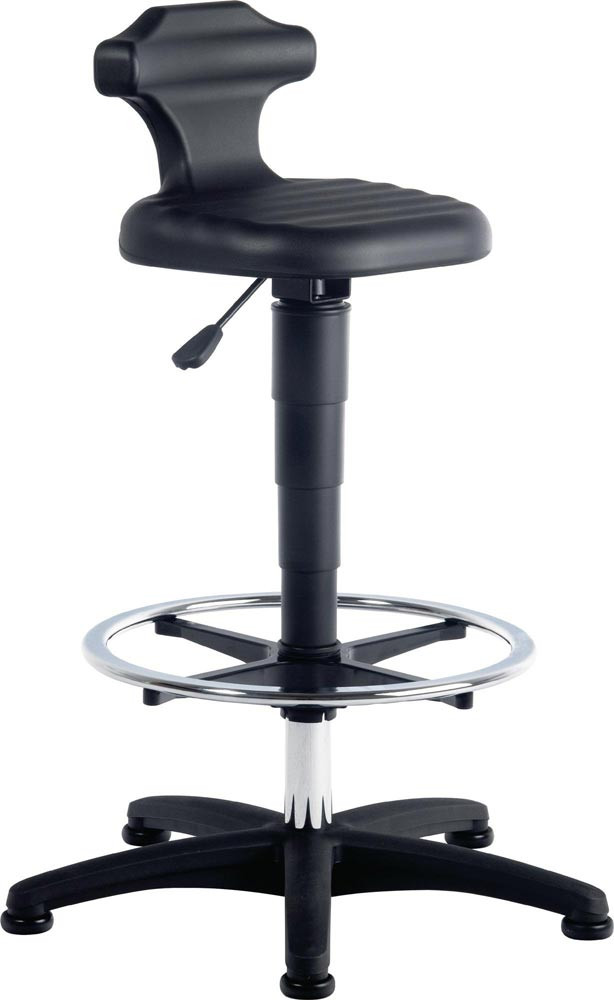 nach DIN 68877 · bedienungsfreundliche Gasfeder-Sitzhöheneinstellung · um 360° drehbar · Sitzfläche mit integrierter Rückenstütze für optimale Entlastung · strukturierte, rutschhemmende Sitz- und Rückenfläche aus softem, schwarzen Integralschaum · Fünffuß-Untergestell aus Kunststoff, flach auslaufend, kipp- und stolpersicher · abriebfeste Kunststoff-Bodengleiter und höhenverstellbarem Fußring, verchromt