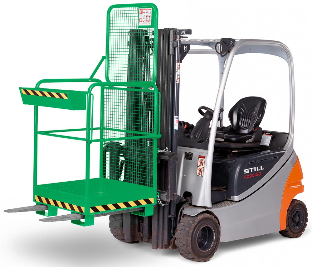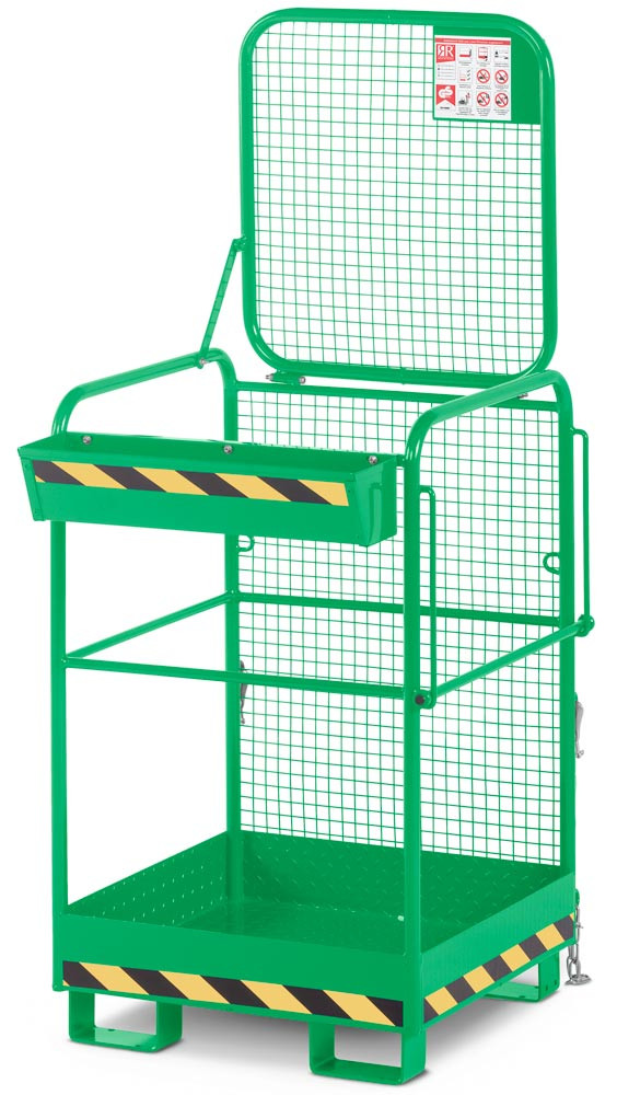 · TÜV geprüfte Sicherheit, entsprechend der DGUV (Deutsche gesetzliche Unfallversicherung) · Stabile Stahlkonstruktion mit rundum Absturzsicherung aus Rohr gemäß UVV · Arbeitskörbe mit TÜV-Zulassung für 2 Personen · Arbeitsplattform aus rutschsicherer Tränenblechkonstruktion mit Abrollschutz · Steckbolzensicherung verhindert das Abrutschen von den Gabelzinken · Pulverbeschichtet · Verzinkte Ausführung auf Anfrage lieferbar ∙ Klappbar auf der Seite der Einfahrtaschen