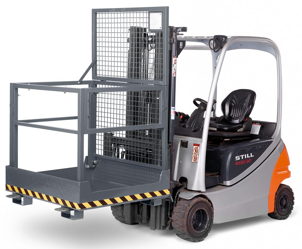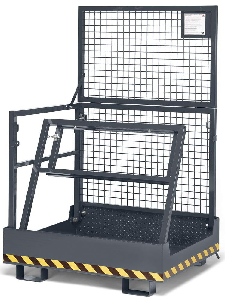 · TÜV geprüfte Sicherheit, entsprechend der DGUV (Deutsche gesetzliche Unfallversicherung) · Stabile Stahlkonstruktion mit rundum Absturzsicherung aus Rohr gemäß UVV · Arbeitskörbe mit TÜV-Zulassung für 2 Personen · Arbeitsplattform aus rutschsicherer Tränenblechkonstruktion mit Abrollschutz · Steckbolzensicherung verhindert das Abrutschen von den Gabelzinken · Pulverbeschichtet · Verzinkte Ausführung auf Anfrage lieferbar ∙ Klappbar auf der Seite der Einfahrtaschen
