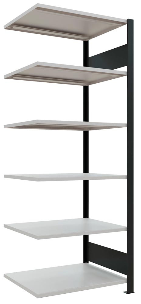 · Ständerrahmen mit Tiefenriegeln, pulverbeschichtet in schwarz · Rahmenfronten ungelocht zur attraktiven Optik · Aussteifung durch Kreuzstrebe · Stahlfachböden mit 25 mm hoher Kante, höhenverstellbar im 25-mm-Raster, RAL 7035 lichtgrau · Ohne Anschlagleiste ∙ Zur einseitigen Regalbestückung