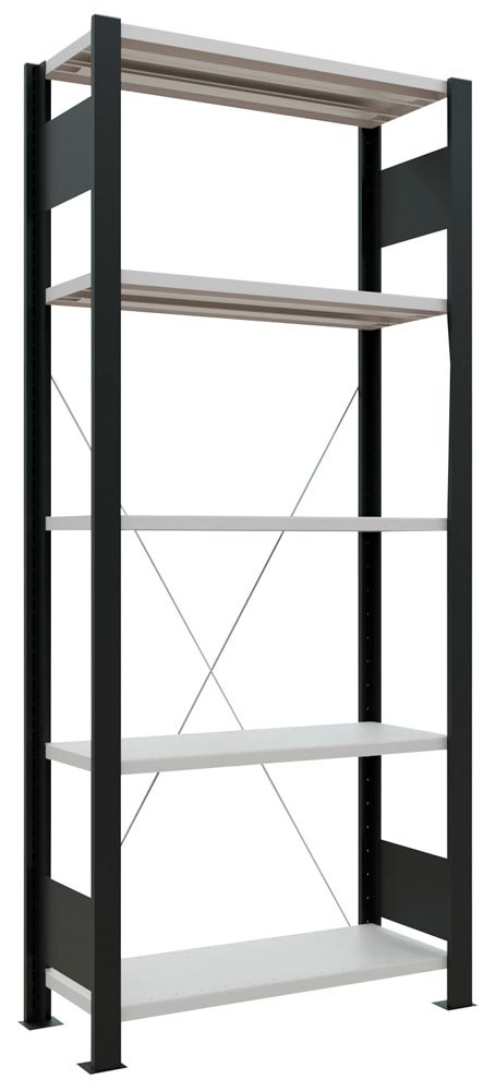 · Ständerrahmen mit Tiefenriegeln, pulverbeschichtet in schwarz · Rahmenfronten ungelocht zur attraktiven Optik · Aussteifung durch Kreuzstrebe · Stahlfachböden mit 25 mm hoher Kante, höhenverstellbar im 25-mm-Raster, RAL 7035 lichtgrau · Ohne Anschlagleiste ∙ Zur einseitigen Regalbestückung
