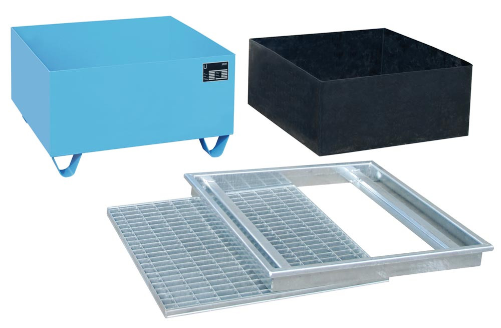 Auffangwanne, Stahlbl., verzinkt, PE-Einsatz, Klemmr., verz. Gitterrost, für 4x200-l Fass, Auffangvolumen 211 l, BxTxH 1215x1215x290 mm
