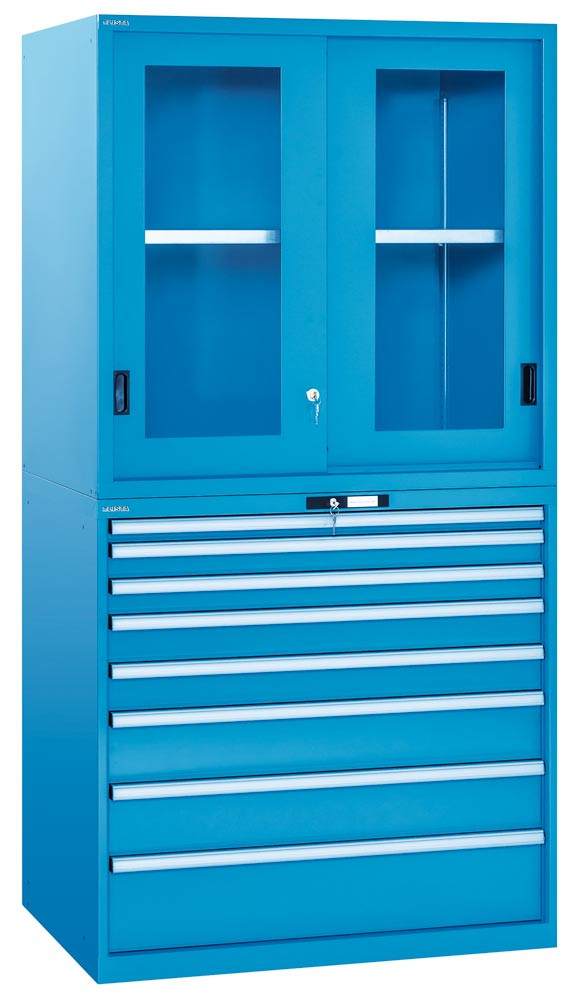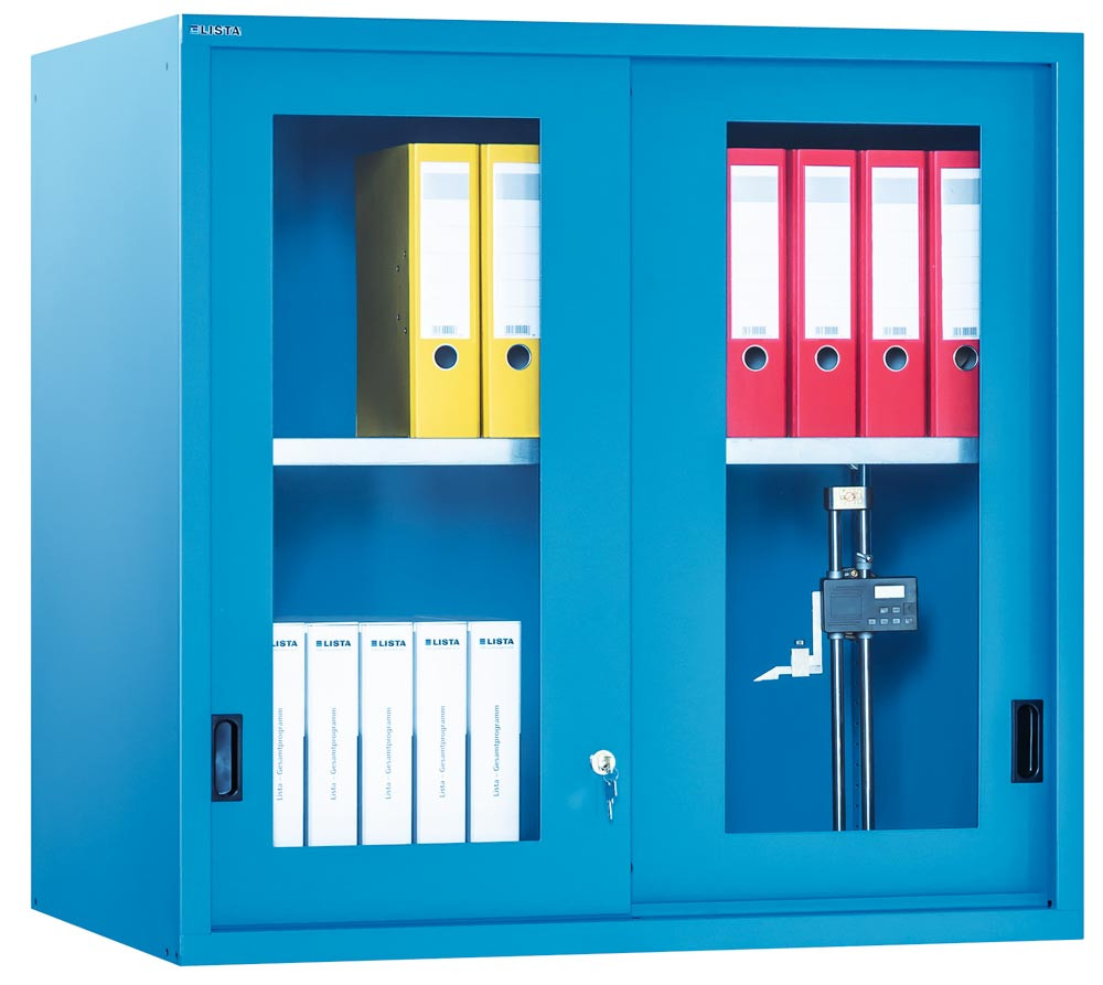 Aufsatzschrank mit Sichtfensterschiebetüren, BxTxH 1023x725x1000 mm, 1 Verstellboden, RAL 5012, passend zu Schubladenschrank 54x36 E E1979461