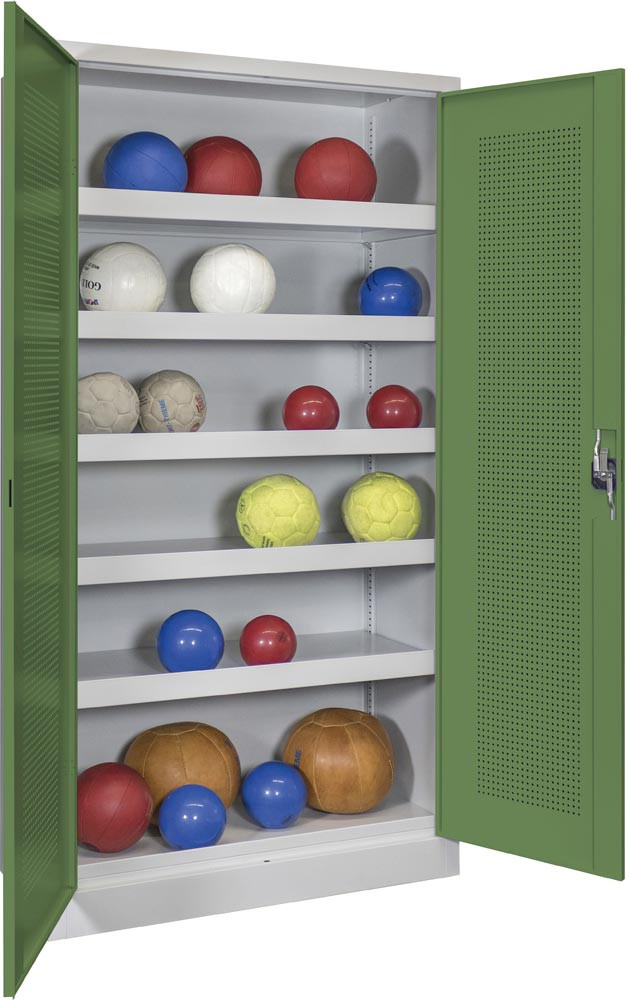 Ballschrank m. Lochblech Flügeltüren, BxTxH 1000x500x1950 mm, 5 lackierte Verstellböden mit Aufkantung, Schloss, RAL 7035/6011 E6020990