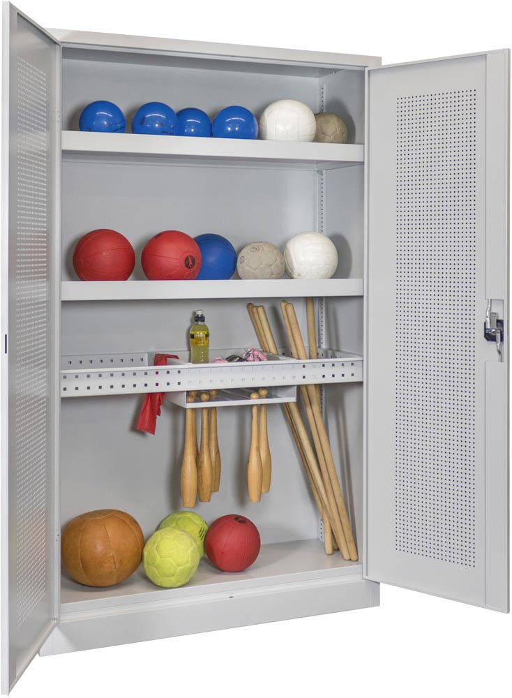 Ballschrank m. Lochblech Flügeltüren, BxTxH 1200x500x1950 mm, 2 Böden, 2 Längs- 2 Quertraversen,Trennsteg, Keulenhalter, Schloss, RAL 7035