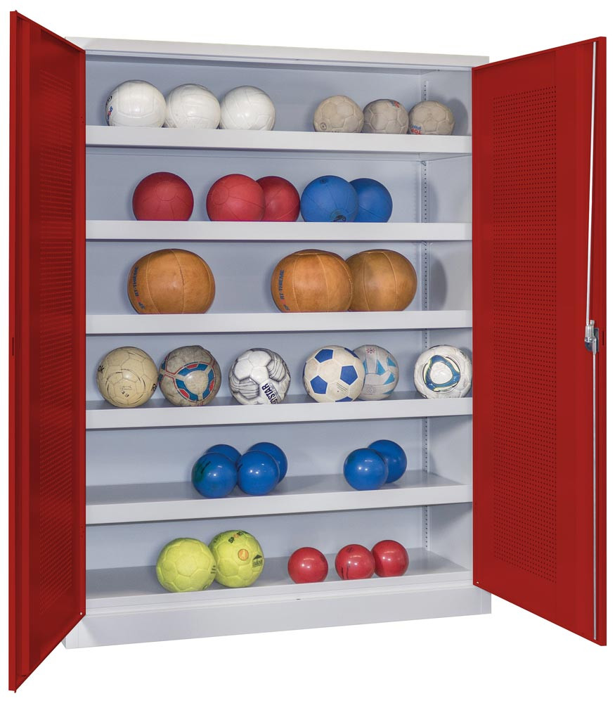 Ballschrank m. Lochblech Flügeltüren, BxTxH 1500x500x1950 mm, 5 lackierte Verstellböden mit Aufkantung, Schloss, RAL 7035/3003