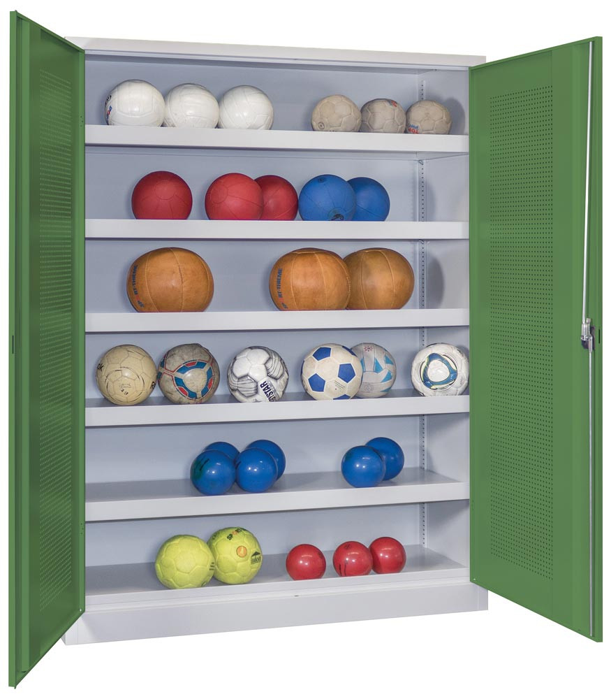 Ballschrank m. Lochblech Flügeltüren, BxTxH 1000x500x1950 mm, 5 lackierte Verstellböden mit Aufkantung, Schloss, RAL 7035/6011 E6020990