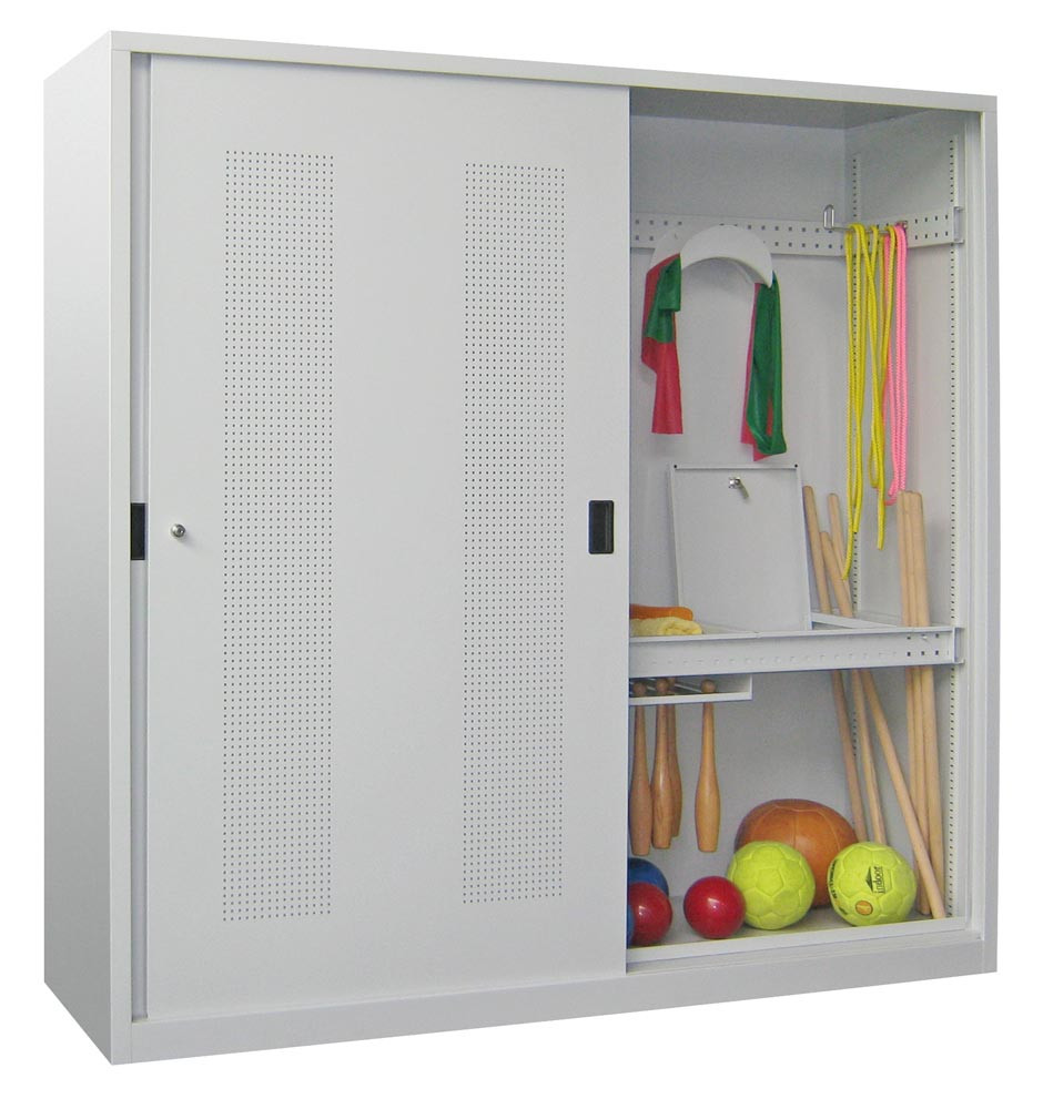 Ballschrank m. Lochblech Schiebetüren, BxTxH 2000x600x1950 mm, 4 Böden, 3 Längs- 4 Quertraversen, Wertfach, Schloss, RAL 7035/3003 E1987017