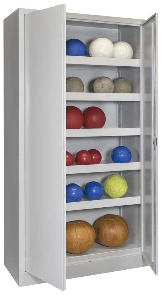 Ballschrank m. Vollblech Flügeltüren, BxTxH 1000x500x1950 mm, 5 lackierte Verstellböden mit Aufkantung, Schloss, RAL 7035 E6020966