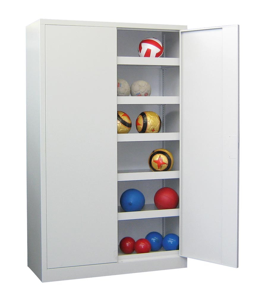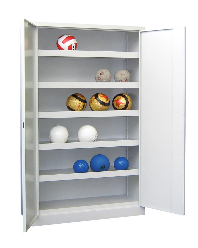 Ballschrank m. Vollblech Flügeltüren, BxTxH 1000x500x1950 mm, 5 lackierte Verstellböden mit Aufkantung, Schloss, RAL 7035 E6020966