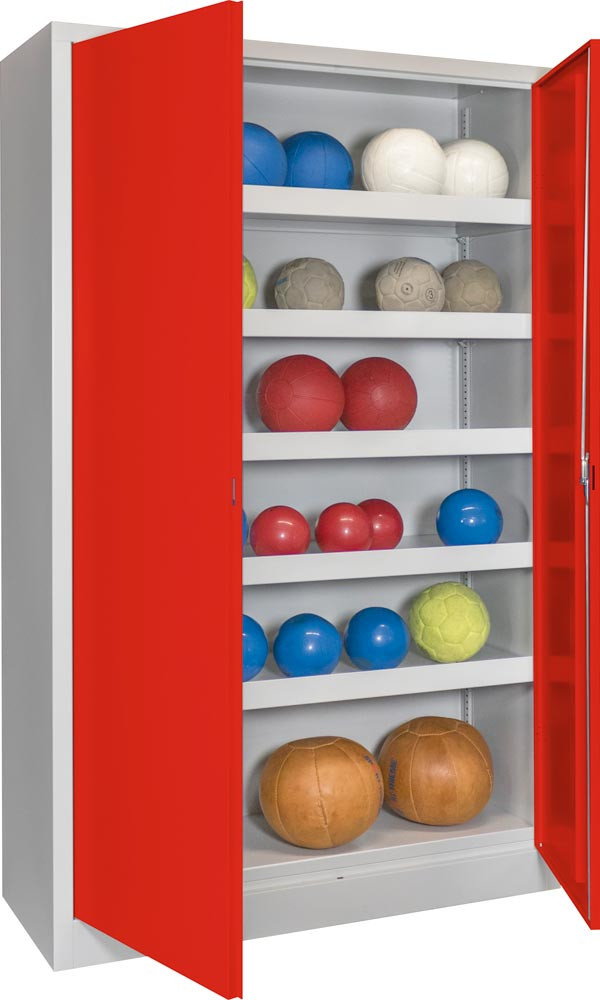 Ballschrank m. Vollblech Flügeltüren, BxTxH 1200x500x1950 mm, 5 lackierte Verstellböden mit Aufkantung, Schloss, RAL 7035/3003