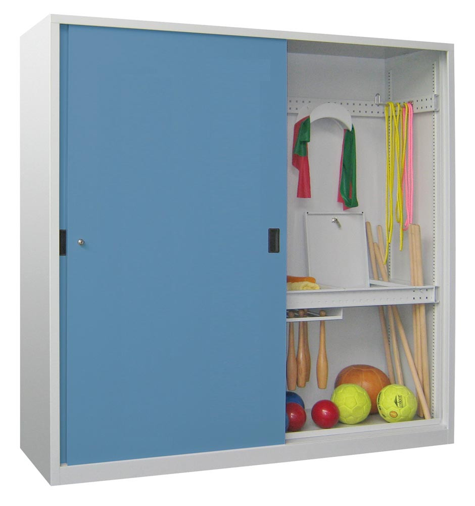 Ballschrank m. Vollblech Schiebetüren, BxTxH 2000x600x1950 mm, 4 Böden, 3 Längs- 4 Quertraversen, Wertfach, Schloss, RAL 7035/5012 E1987011