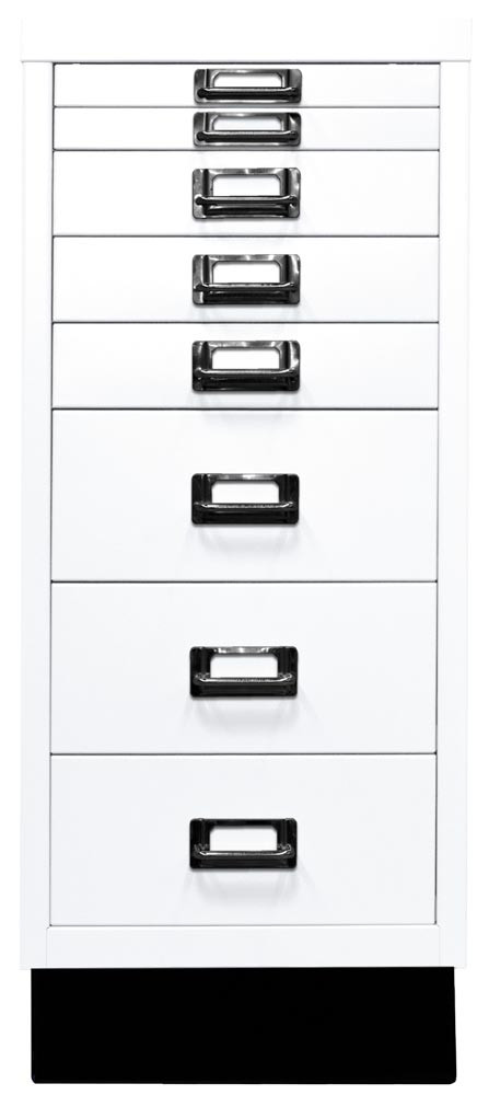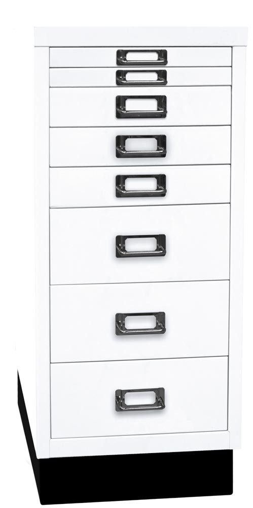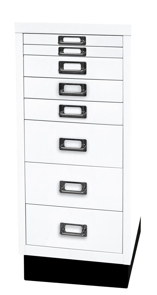 Büro-Schubladenschrank, BxTxH 279x380x670 mm, 8 Schubladen 2x25, 3x51, 3x102 mm, DIN A4, Sockel 80 mm hoch, verkehrweiß