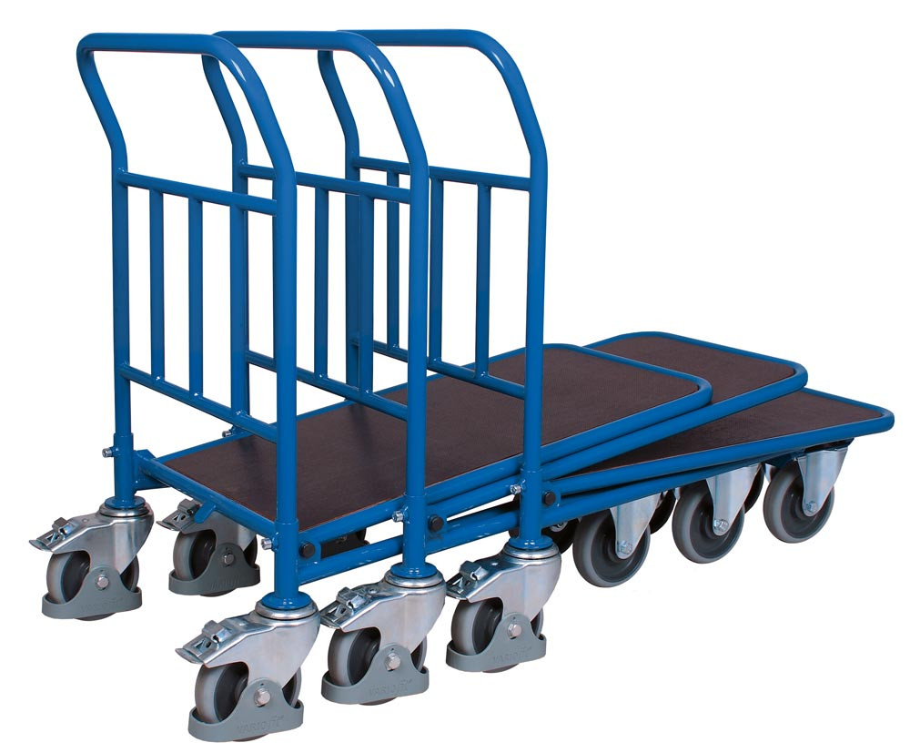 ∙ Ineinanderschiebbare Wagen ∙ 75 % Stellraum-Einsparung ∙ Schweißkonstruktion aus Stahlrohr ∙ RAL 5010 enzianblau pulverbeschichtet ∙ Schlag- und kratzfest ∙ Ladefläche aus rutschsicherer Siebdruckplatte aus wasserfestem Sperrholz ∙ 2 Lenk- und 2 Bockrollen · Lenkrollen gemäß EN 1757-3 mit Rad-Feststeller und Fußschutz · Thermoplastische Vollgummi-Bereifung, grau "spurlos" · Naben mit Präzisions-Rillenkugellager und Fadenschutz