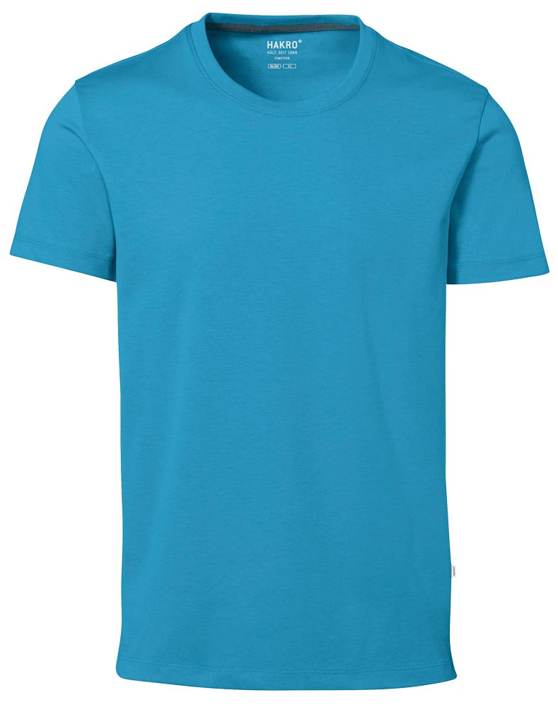 Single-Jersey aus 50% Baumwolle/50% Polyester, ca. 185 g/m2 ∙ T-Shirt mit rundem Halsausschnitt und Nackenband ∙ Kragennaht und Innenseite der Seitenschlitze mit kontrastfarbigem Gewebeband belegt ∙ Durch ein spezielles Strickverfahren hergestellt, bei dem zwei Garne zu einem HAKRO COTTON TEC®-Double-Face-Material verarbeitet werden ∙ Innenseite mit Mesh-Lage aus Funktionsfaser TRIACTIVE ∙ Einlaufvorbehandelt ∙ Atmungsaktiv