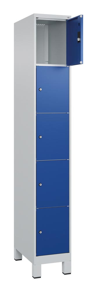 Fächerschrank, BxTxH 300x500x1950 mm, 1x5 Fächer, Abt.B 300 mm, Füße, Schloss, glatte Türen, RAL 7035/5010 E6479351