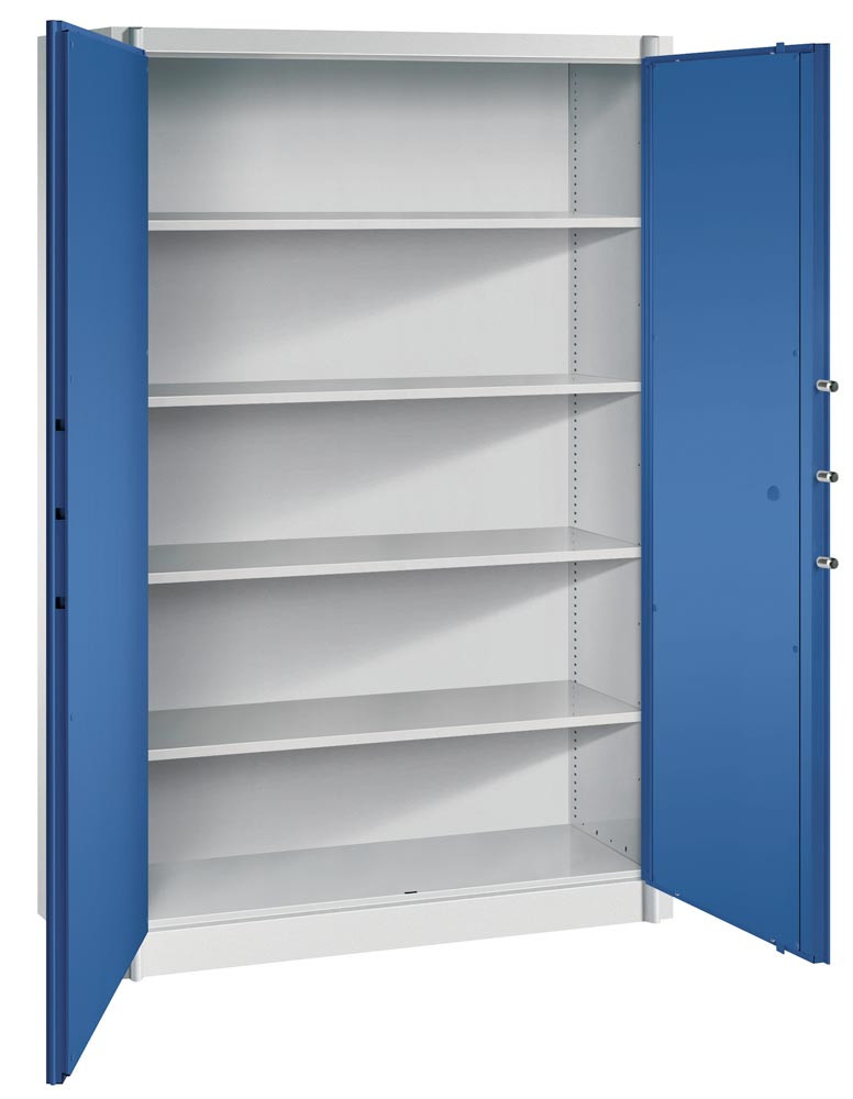 Feuergeschützter Flügeltürenschrank, BxTxH 1200x500x1950 mm, 2-türig, 4 Fachböden, RAL 7035/5010 lichtgrau/enzianblau