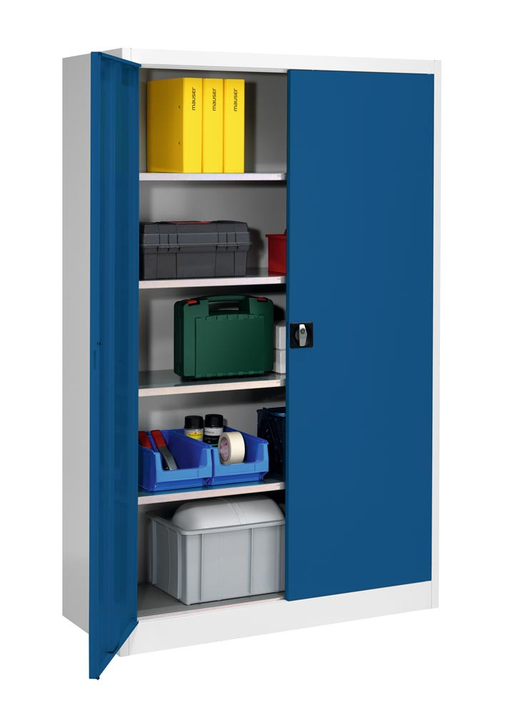 Flügeltürenschrank, 4 verz. Fachböden, BxTxH 950x500x1965 mm, RAL7035 lichtgrau/RAL5010 enzianblau E6410353