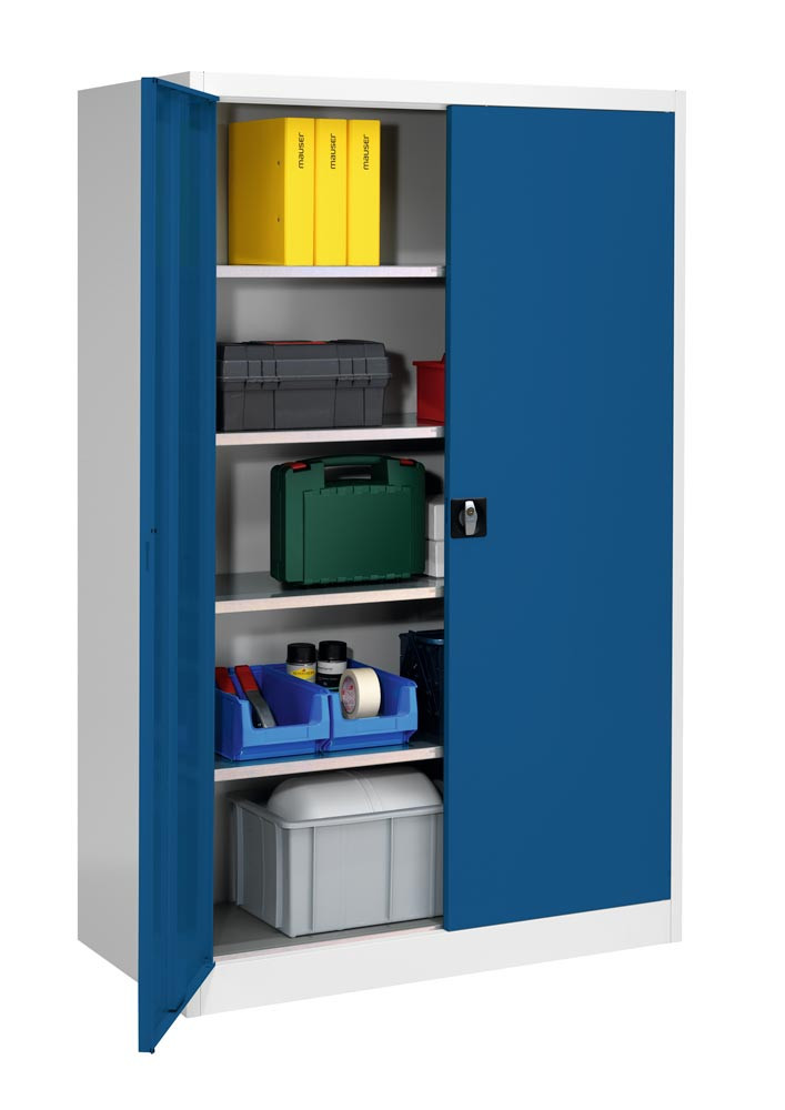 Flügeltürenschrank, 4 verz. Fachböden, BxTxH 950x600x1965 mm, RAL7035 lichtgrau/RAL5010 enzianblau E6410356
