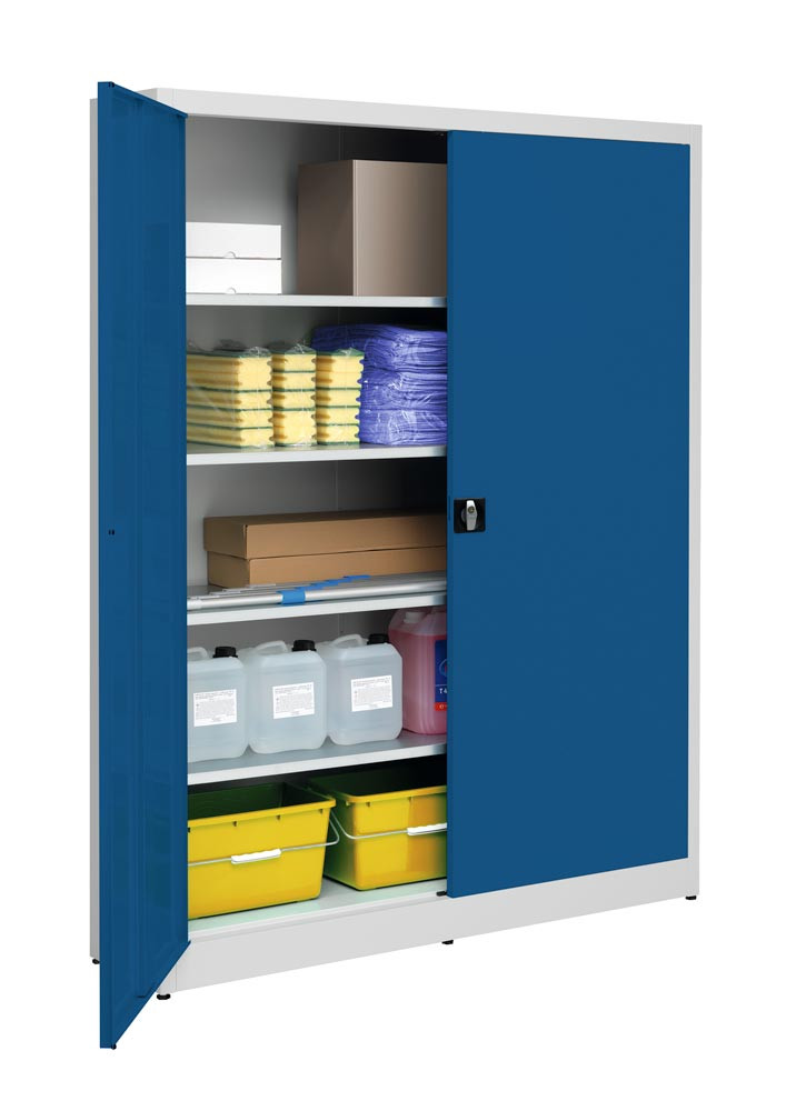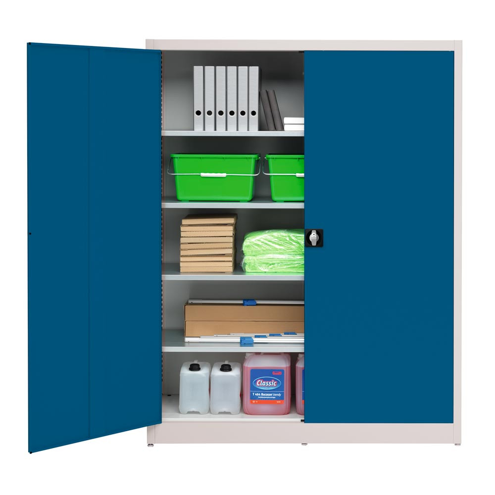 Flügeltürenschrank, 4 verz. Fachböden, BxTxH 1500x420x1965 mm, RAL7035 lichtgrau/RAL5010 enzianblau