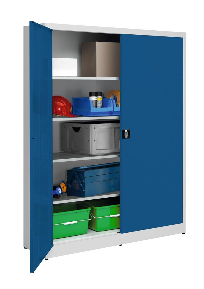 Flügeltürenschrank, 4 verz. Fachböden, BxTxH 1500x500x1965 mm, RAL7035 lichtgrau/RAL5010 enzianblau