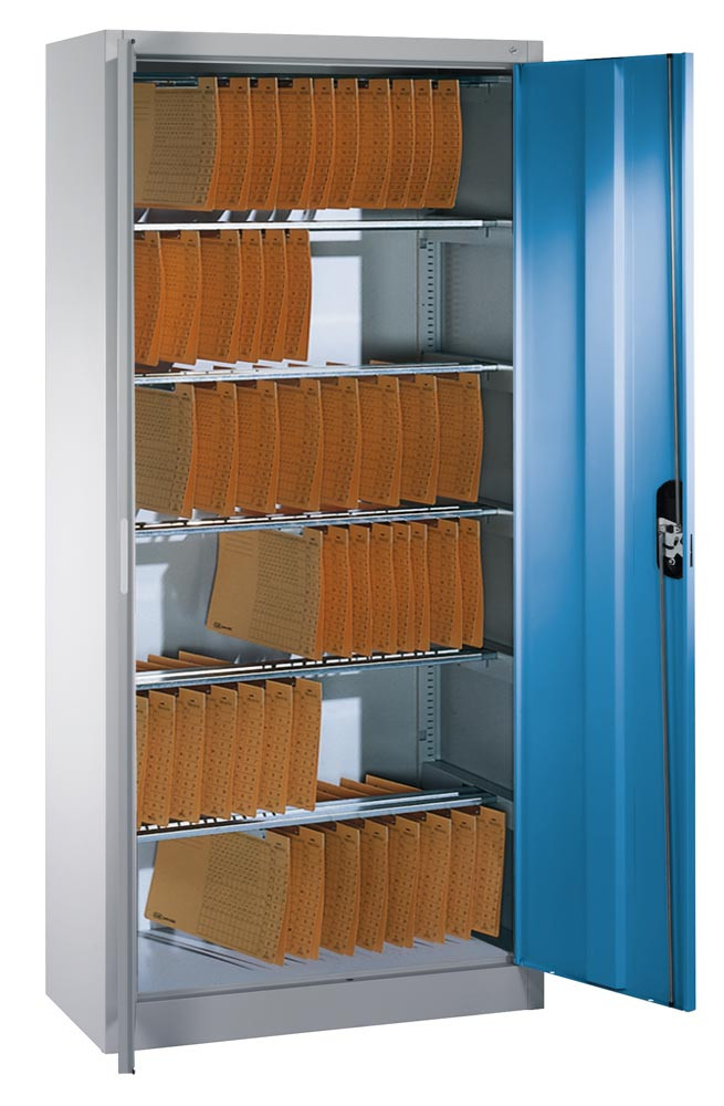 Flügeltürenschrank, BxTxH 930x400x1950 mm, 6 Pendelstangen System Elba/Leitz, RAL 7035/5012 lichtgrau/lichtblau