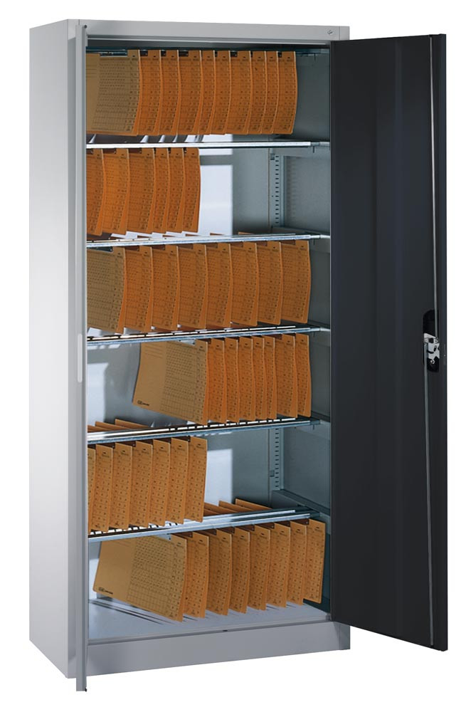 Flügeltürenschrank, BxTxH 930x400x1950 mm, 6 Pendelstangen System Elba/Leitz, RAL 7035/7021 lichtgrau/schwarzgrau