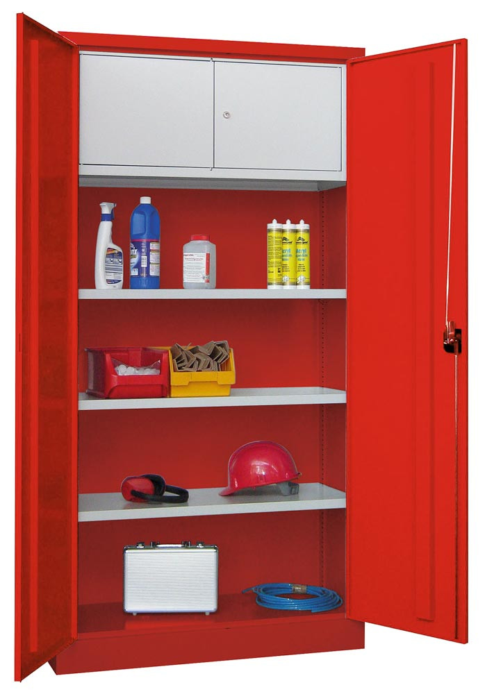 · Stabile Stahlblechkonstruktion, Böden fest verschweißt · Oberfläche pulverbeschichtet · Schränke mit gemeinsam verschließbaren Türen und Verstärkungstaschen ∙ Verriegelung mit Zylinderschloss inkl. 2 Schlüsseln ∙ Glatter, ausfegbarer Boden