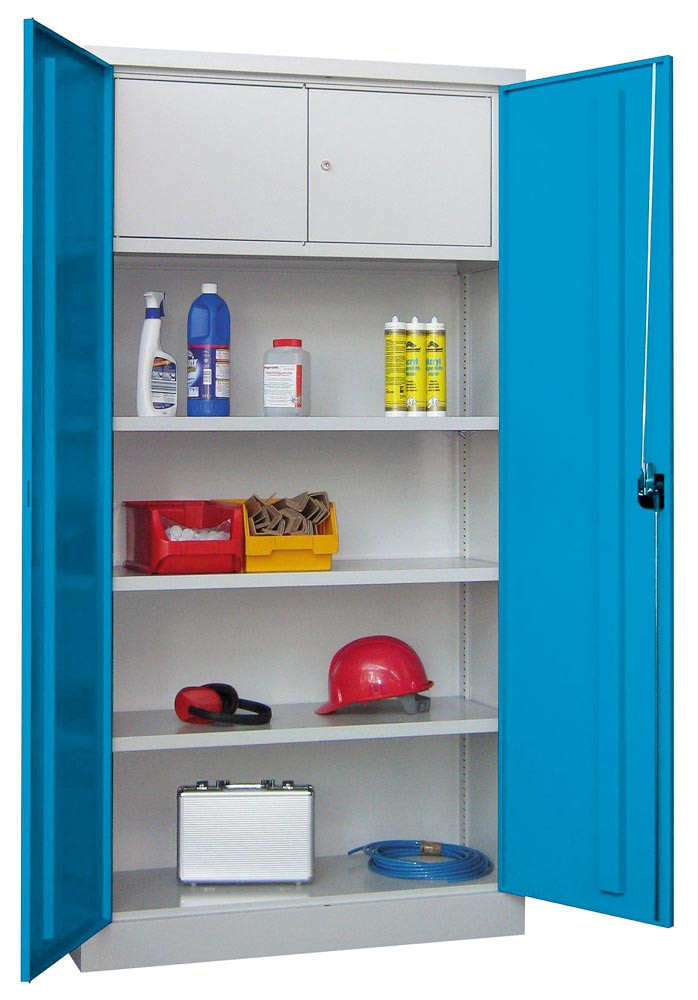 · Stabile Stahlblechkonstruktion, Böden fest verschweißt · Oberfläche pulverbeschichtet · Schränke mit gemeinsam verschließbaren Türen und Verstärkungstaschen ∙ Verriegelung mit Zylinderschloss inkl. 2 Schlüsseln ∙ Glatter, ausfegbarer Boden