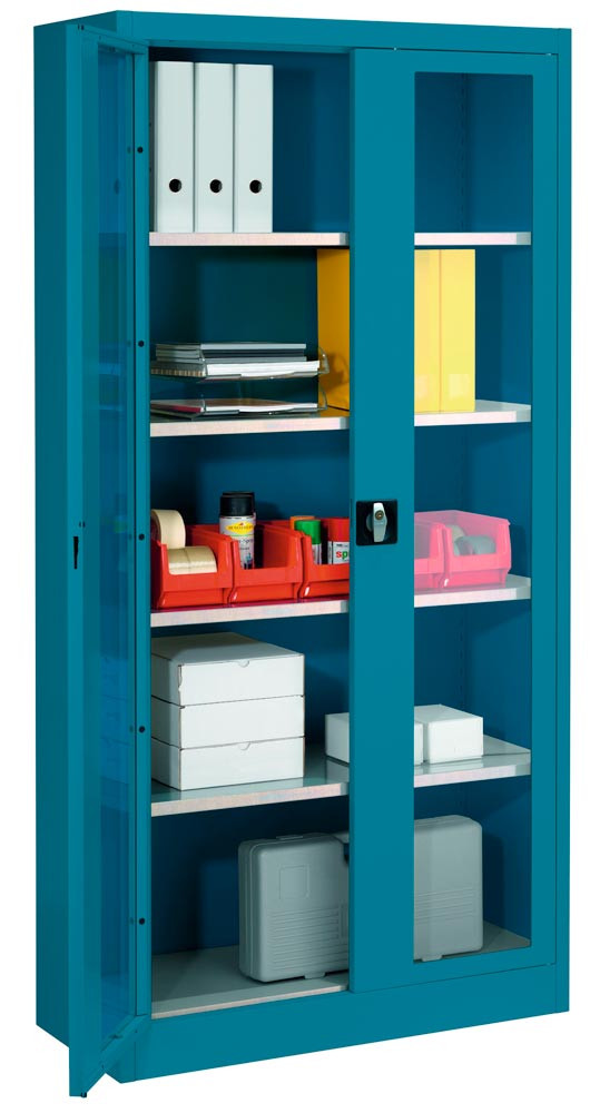 Flügeltürenschrank mit Sichtfenster, leer, BxTxH 950x420x1950 mm, 4 Böden, RAL 5007/5007 brilliantblau