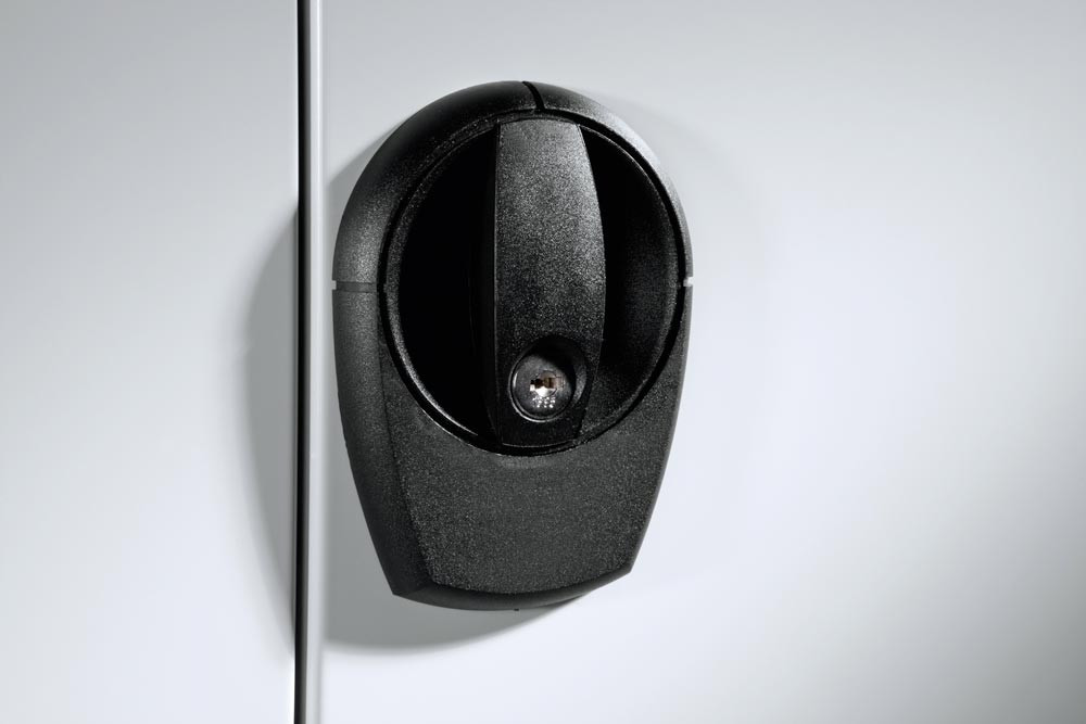 ∙ #7;Flügeltüren mit Türverstärkung, in Drehbolzen gelagert, mit dreiriegeligem Rundgriffverschluss und 2 Schlüsseln