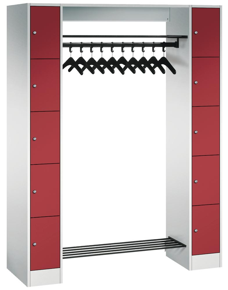 Schließfachschränke mit 5 Fächern übereinander bieten in Kombination mit funktionalen Garderobeneinheiten für 5, 10, 15 oder 20 Personen ausreichend Platz für Kleidung und persönliche Dinge.