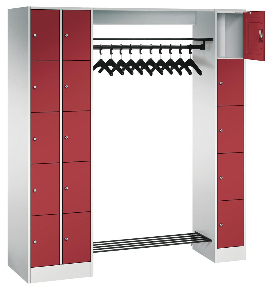 Schließfachschränke mit 5 Fächern übereinander bieten in Kombination mit funktionalen Garderobeneinheiten für 5, 10, 15 oder 20 Personen ausreichend Platz für Kleidung und persönliche Dinge.