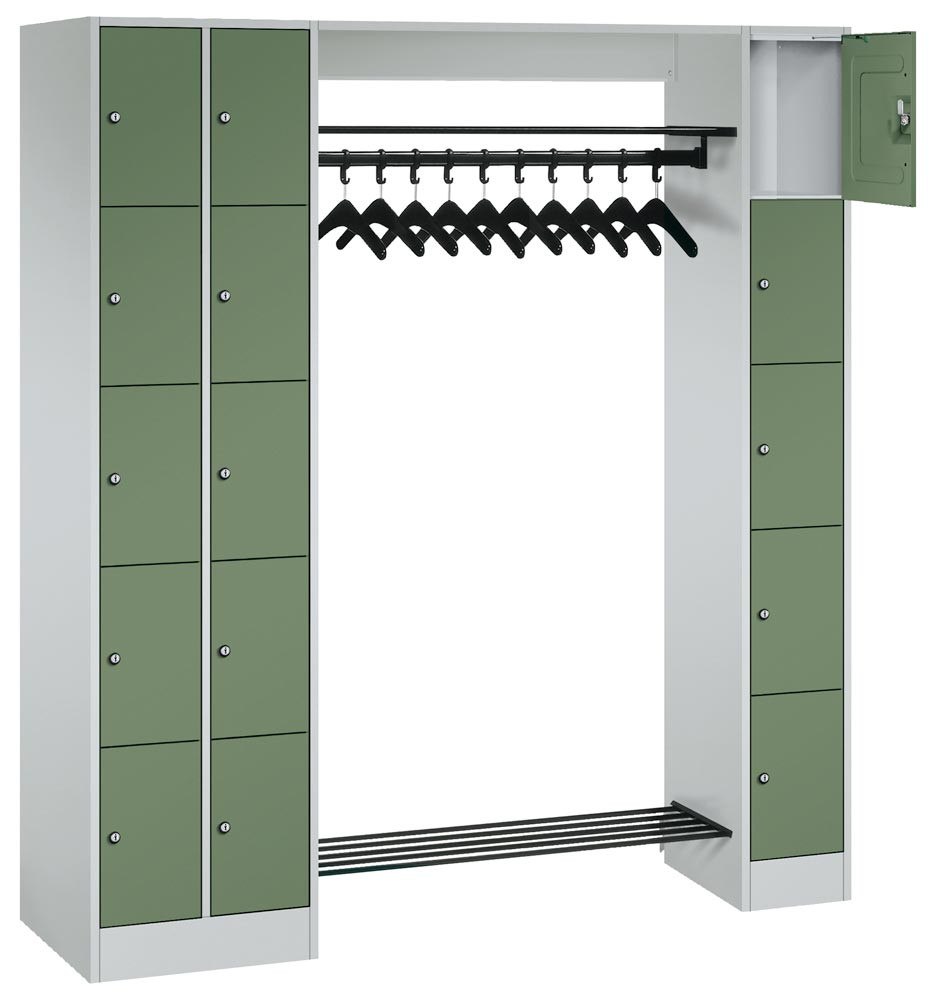Schließfachschränke mit 5 Fächern übereinander bieten in Kombination mit funktionalen Garderobeneinheiten für 5, 10, 15 oder 20 Personen ausreichend Platz für Kleidung und persönliche Dinge.