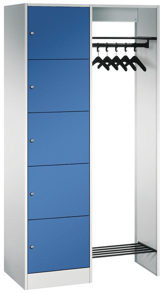 Schließfachschränke mit 5 Fächern übereinander bieten in Kombination mit funktionalen Garderobeneinheiten für 5, 10, 15 oder 20 Personen ausreichend Platz für Kleidung und persönliche Dinge.