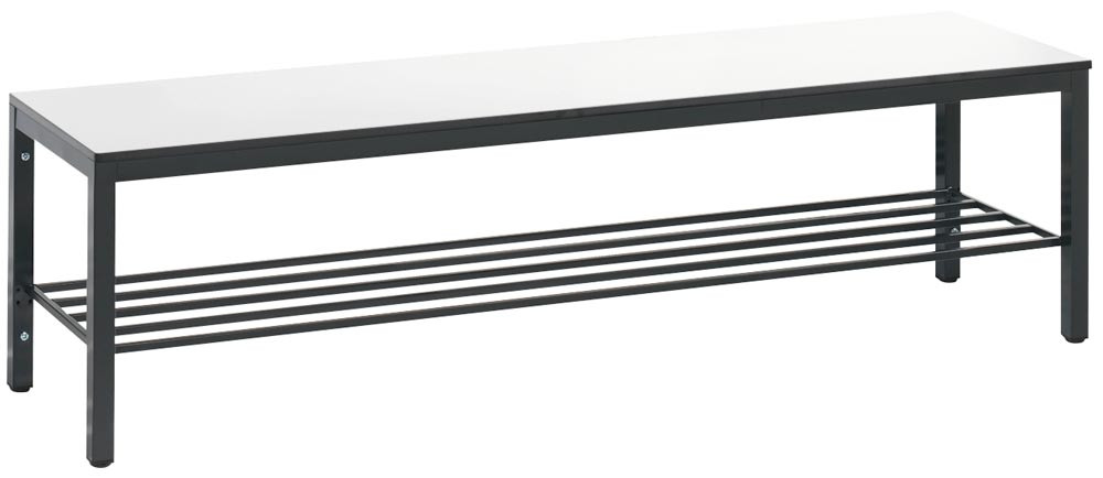 Garderobenbank, Sitzfläche HPL-Platte weiß, mit Schuhrost, BxTxH 1500x353x401 mm, 4 Füße, Gestell RAL 7021 E6409450