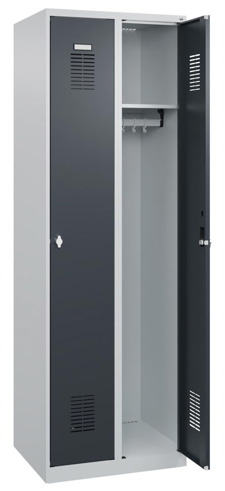 ∙ Stabile Stahlkonstruktion mit hochwertiger Einbrennbeschichtung ∙ Verstärkte Türen mit Anschlagsdämpfer für geräuscharmes Schließen ∙ Lochbild in der Tür für optimale Belüftung ∙ Stabile Garderobenstange mit 3 verdrehsicheren Schiebehaken ∙ Glatter Abteilboden für einfaches Auskehren ∙ Fußteil und Schrankboden serienmäßig verzinkt für erhöhten Korrosionsschutz ∙ Fest verschweißter Ablageboden pro Abteil ∙ Optimierte Lüftungsöffnungen im Abteil · Pro Abteil 1 Ablageboden · T x H 500 x 1850 mm · Wahlweise 2, 3 oder 4 Abteile, jeweils 300 mm breit · Drehriegelverschluss für Vorhangschloss