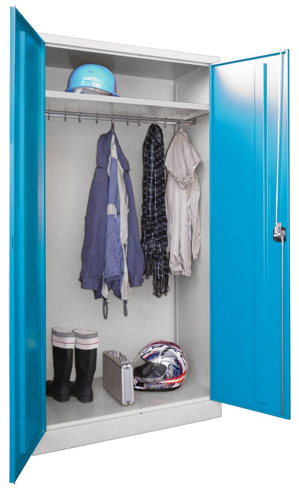 Garderobenschrank, durchg. beschichteter Hutboden, darunter Stange mit 10 Haken, Zyl.-Schl., BxTxH 1000x500x1950 mm, RAL 5010 E1572780