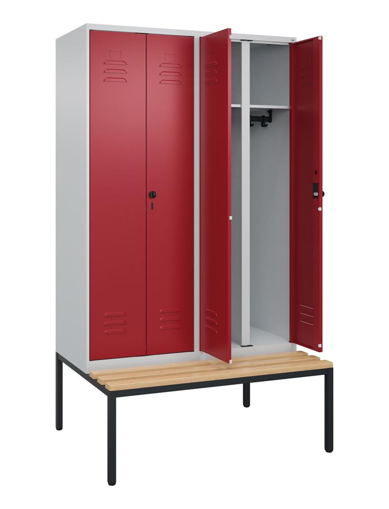 Garderobenschrank, untergeb. Sitzbank, BxTxH 600x500x2120 mm, 2 Abteile, Abt.B 300 mm, Holzleisten, Drehriegel, RAL 7035/5010 E6476240