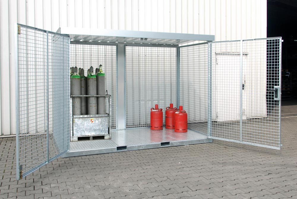 ∙ Stabile Rahmenkonstruktion mit Dach und Boden ∙ Abschließbares Flügeltor ∙ Zur vorschriftsmäßigen Lagerung von Gasflaschen im Außenbereich ∙ Ausführung nach TRGS 510 ∙ Einfahrtaschen zur Aufnahme mit einem Gabelstapler ∙ Oberfläche feuerverzinkt nach EN ISO 1461